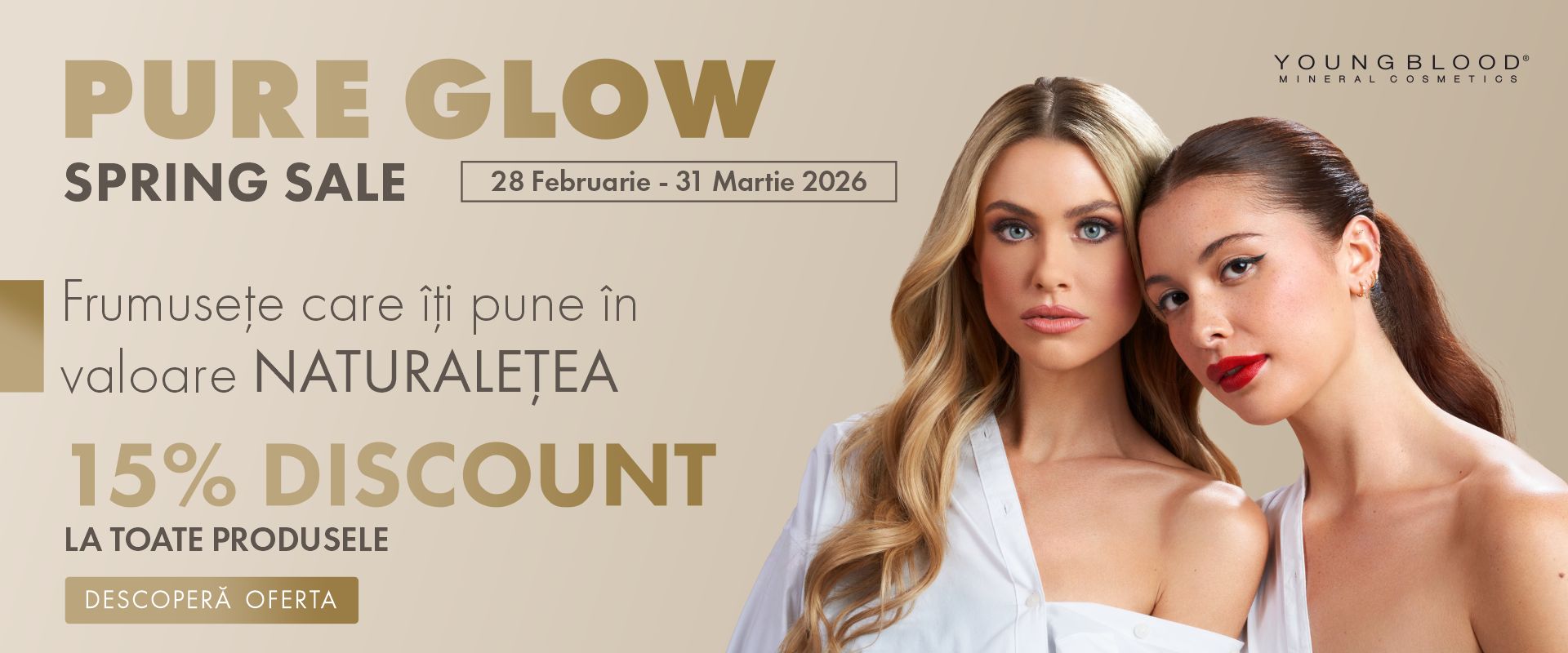 Pure Glow – Spring Sale 2026 îți oferă -15% DISCOUNT la toate produsele de machiaj mineral profesional. Evidențiază naturalețea pielii cu formule curate, performante și potrivite pentru toate tipurile de ten. Ofertă valabilă 28 februarie – 31 martie 2026, exclusiv online.